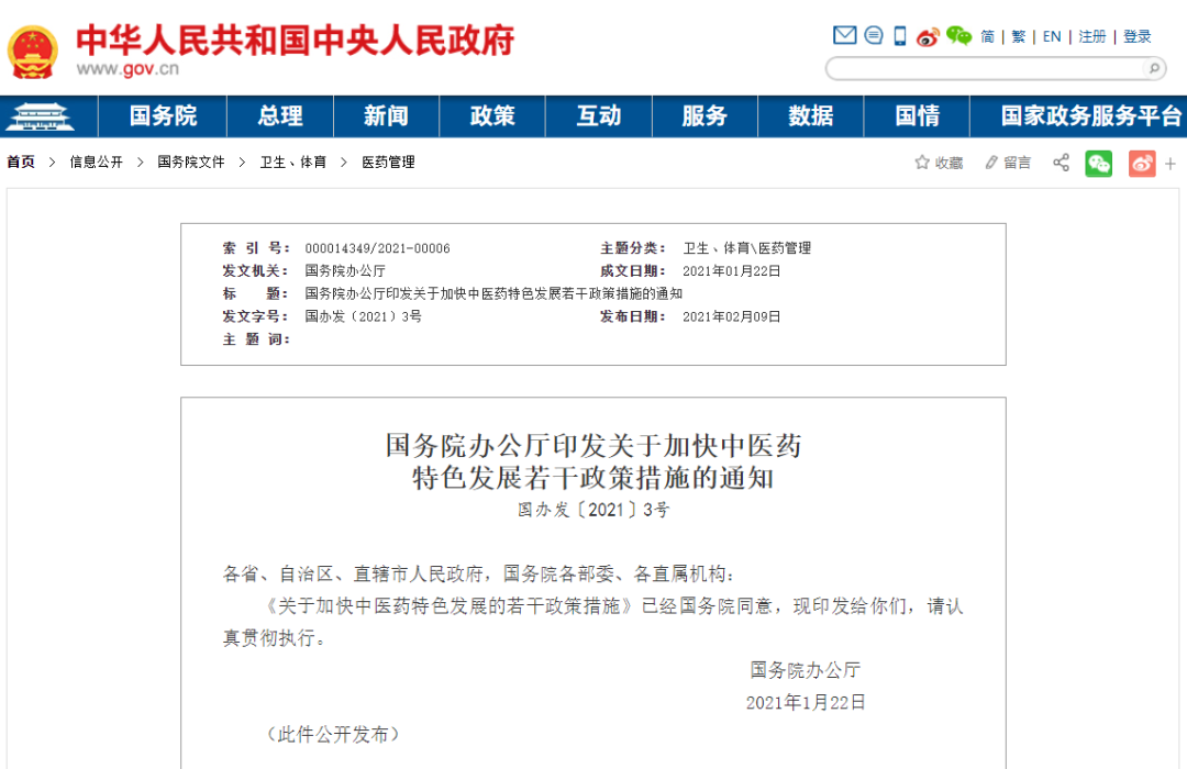 近日,国务院办公厅印发《关于加快中医药特色发展若干政策措施的通知》。