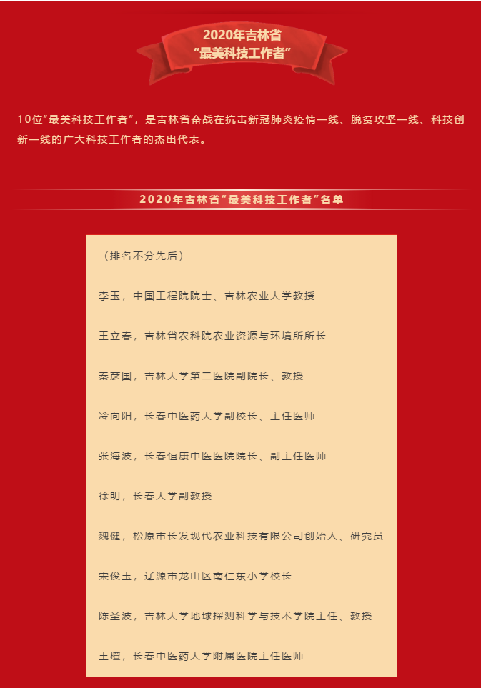 近日,吉林省委宣传部、吉林省科学技术协会、吉林省科技厅、中科院长春分院、吉林省国防科工办联合组织开展2020年吉林省“最美科技工作者”评选活动。经过严格评选与审核,共评选出10位奋战在抗击新冠肺炎疫情一线、脱贫攻坚一线、科技创新一线的广大科技工作者的杰出代表。