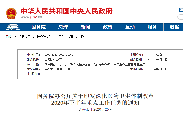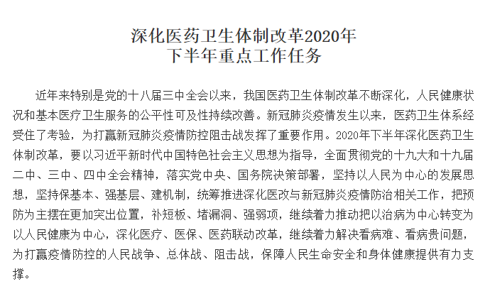 一、加强公共卫生体系建设 (一)改革完善疾病预防控制体系。优化完善疾病预防控制机构职能设置,改善疾病预防控制基础条件。完善医防协同机制,强化各级医疗机构疾病预防控制职责,增强公立医院传染病救治能力,推动医防机构人员通、信息通、资源通。加强乡镇卫生院和社区卫生服务中心疾病预防控制职责,健全疾病预防控制机构与城乡社区联动工作机制。加强口岸传染病防控能力建设。(国家卫生健康委、海关总署分别负责,国家发展改革委、财政部、人力资源社会保障部、国家中医药局等参与。分别负责为各部门按职责分别牵头,下同) 二、深入实施健康中国行动 (六)持续改善生产生活环境,倡导健康文明生活方式。完善健康科普工作机制。深入开展农村人居环境整治。完善农贸市场新冠肺炎疫情防控技术指南。推进农贸市场标准化建设,规范功能分区和布局,加大规范化管理和监督执法力度。推进修订预包装食品营养标签通则。制定深入开展新时代爱国卫生运动的指导性文件。(生态环境部、农业农村部、商务部、国家卫生健康委、市场监管总局分别负责) (七)加强重点人群健康促进。开展全国综合防控儿童青少年近视评议考核。全面加强和改进学校体育、卫生与健康教育工作。推动妇幼保健机构机制创新试点扩面。制定医养结合机构管理指南。加强为老年人提供上门医疗卫生服务工作。实施社区医养结合能力提升工程。(教育部、国家卫生健康委分别负责,国家发展改革委、民政部、体育总局、国家中医药局参与) (八)提升慢性病防治水平。完善公共卫生服务项目。以高血压、糖尿病等慢性病管理为突破口,强化基层防治结合。以心脑血管疾病、癌症、尘肺病早期筛查干预为切入点,推进疾病预防控制机构与医疗机构业务融合。制定癌症预防与筛查指南(科普版)。推进社会心理服务体系建设试点工作。(国家卫生健康委、财政部、国家中医药局等负责) (九)加大传染病、地方病、职业病等防治力度。做好冬春季流感防控工作。实现消除疟疾目标,控制和消除大骨节病等重点地方病和血吸虫病危害,基本控制包虫病流行。推进职业健康达人工作。(国家卫生健康委、国家中医药局负责) 三、深化公立医院综合改革 (十)健全医疗卫生机构和医务人员绩效考核机制。完善三级公立医院绩效考核,启动二级公立医院绩效考核,推进妇幼保健机构绩效考核。将疾病预防控制、公共卫生应急、健康促进与教育等纳入考核范围。推进公立医院经济运行信息公开。推进建立健全现代医院管理制度试点,深入开展公立医院综合改革示范和绩效评价工作。制定推进公立医院高质量发展的政策文件。(国家卫生健康委、国家中医药局分别负责,人力资源社会保障部等参与) (十一)建立和完善医疗服务价格动态调整机制。指导各省份按照设置启动条件、评估触发实施、有升有降调价、医保支付衔接、跟踪监测考核的基本路径,整体设计动态调整机制,抓住药品耗材集中采购、取消医用耗材加成等降低药品耗材费用的窗口期,及时进行调价评估,达到启动条件的要稳妥有序调整价格。推动完善医疗服务项目准入制度,加快审核新增医疗服务价格项目。监测公立医疗机构医疗服务价格、成本、费用、收入分配及改革运行情况等,作为实施医疗服务价格动态调整的基础。强化公立医疗机构医疗服务成本核算。(国家卫生健康委、国家医保局、国家中医药局分别负责) (十二)深化薪酬制度和编制管理改革。落实“两个允许”要求,全面推开公立医院薪酬制度改革,指导地方完善公立医院薪酬总量核定、内部绩效考核和收入分配办法,建立健全医疗卫生机构保障与激励相结合的运行机制。统筹盘活用好医疗卫生领域编制资源,重点用于加强公立医院、基层医疗卫生机构、各级疾病预防控制等公共卫生机构编制配备。(中央编办、人力资源社会保障部分别负责,财政部、国家卫生健康委、国家医保局、国家中医药局参与) (十三)落实政府对符合区域卫生规划的公立医院基本建设和设备购置等投入政策,加大对中医医院、传染病医院的支持力度。积极稳妥推进化解公立医院符合规定的长期债务,严禁举债建设和超标准装修,对公立医院违规举债行为严肃问责。(国家发展改革委、财政部、国家卫生健康委、国家中医药局分别负责) 四、深化医疗保障制度改革 (十四)提高基本医疗保障水平。城乡居民医保人均财政补助标准增加30元,稳步提高个人缴费标准。完善重大疫情医疗救治费用保障机制。开展门诊费用跨省直接结算试点。(国家医保局、财政部负责) (十五)推进医保支付方式改革。推进按疾病诊断相关分组付费国家试点和按病种付费。健全医保经办机构与医疗机构之间的协商谈判机制,合理确定、动态调整医保基金总额预算指标,有条件的地方可加大周转金预拨力度,减轻医疗机构垫付压力。探索紧密型医疗联合体实行总额付费,加强监督考核,结余留用、合理超支分担。制定建立医保药品支付标准的指导意见。(国家医保局、国家卫生健康委、国家中医药局负责) (十六)加强医保基金管理,健全监管机制。开展基于大数据的医保智能监控,推广视频监控、人脸识别等技术应用,探索实行省级集中监控。推进“互联网+医疗保障”,加快建设全国统一的医疗保障信息